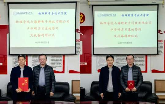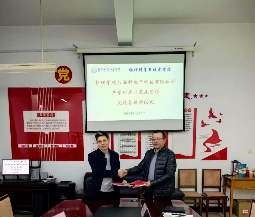 2025年11月21日,秦皇岛海昕电子科技有限公司捐赠仪式暨与球天下校企合作签约仪式在院会议室隆重举行。秦皇岛海昕电子科技有限公司总经理杨刚、副总经理龚立峰及技术骨干代表郑金宝,球天下经理李志新、副经理辛伟、微电子科学与工程专业负责人庄萃萃、微电子科学与工程专业实验室负责人刘鑫出席仪式。