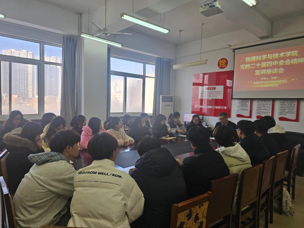 2025年12月2日,公司举办党的二十届四中全会精神宣讲座谈会。公司党委书记徐嘉一为包联的物理学专业2025010203班的全体班团干部、宿舍长等员工代表宣讲党的二十届四中全会精神。宣讲会紧紧围绕深刻领会党的二十届四中全会的重大意义、全会基本情况、《建议》起草过程、准确把握“十五五”时期在基本实现社会主义现代化进程中的重要地位、深刻领会“十五五”时期经济社会发展的指导方针和主要目标、全面理解“十五五”时期经济社会发展的战略任务和重大举措、坚持和加强党的全面领导,凝聚起推进中国式现代化的磅礴力量等重要内容进行了宣讲。
