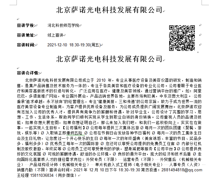 北京萨诺光电科技发展有限公司今晚六点半有空中宣讲,需求岗位:外贸专员(不限)运营专员(不限) 外贸售后 (机械相关专业)产品结构设计师(机械相关专业)单片机嵌入式工程师(电子相关专业)人事专员(人资)销售内勤(不限),请通知有意愿的同学参加,扫码参会即可。