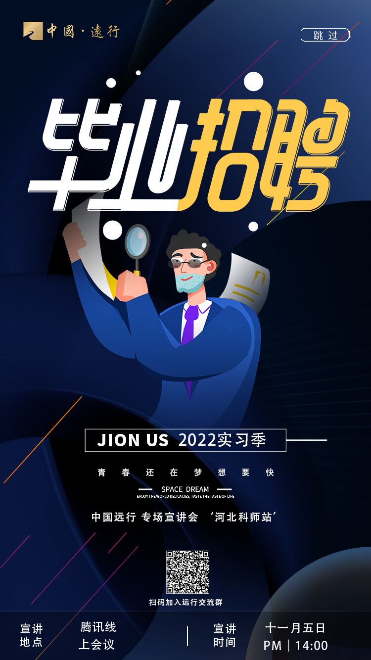 会议主题:河北科师&中国远行2022专场宣讲会会议时间:2021/11/05 14:00-15:00 点击链接入会,或添加至会议列表:https://meeting.tencent.com/dm/QIpoJyG0rDqS会议 ID:529 682 557