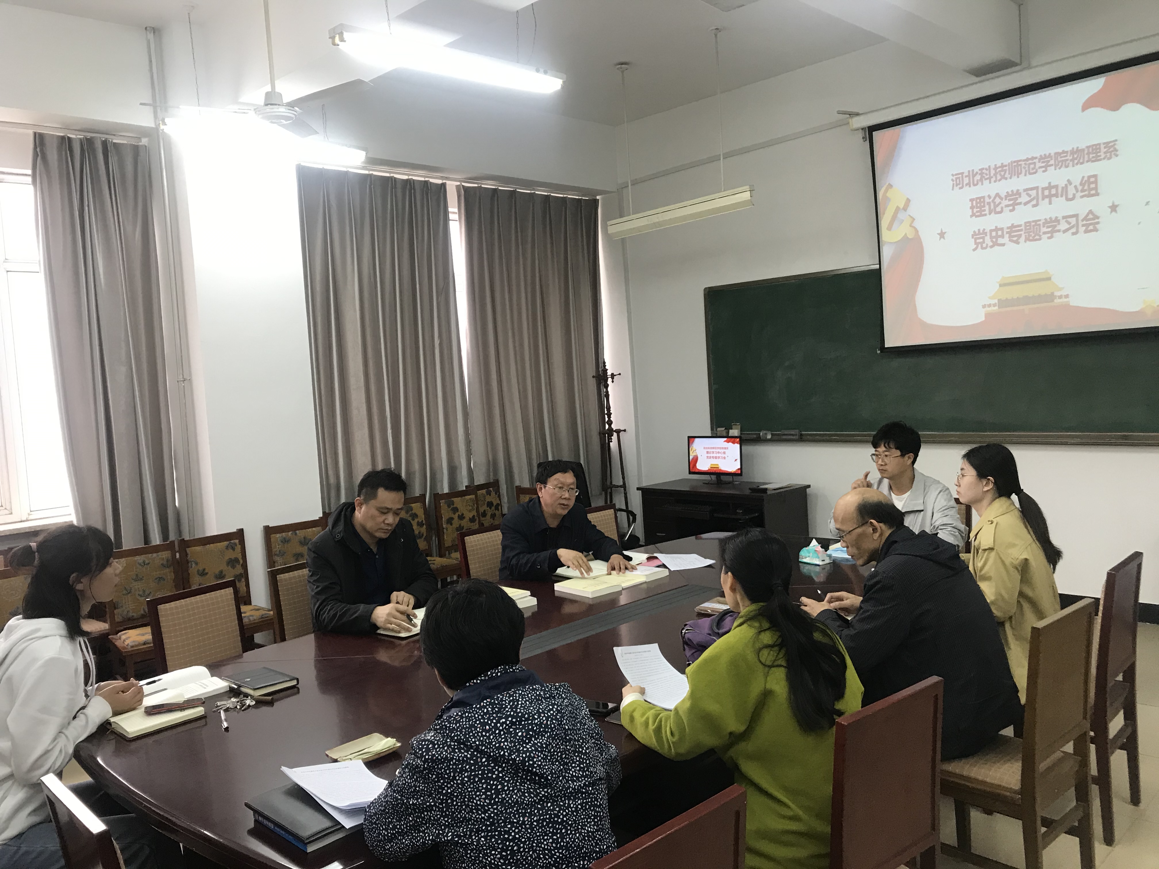2021年4月15日下午,物理系党总支理论学习中心组集中学习党史,专题学习了习近平《论中国共产党历史》前4个专题。系党总支书记赵维新主持会议并讲话,系党总支委员、专职组织员以及各党支部书记参加了学习会。
